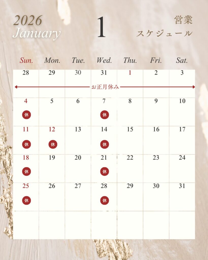 ニュース1月の休診日 shirokuma 2025年12月5日 2026年1月のお休みです。カレンダーの通り、水曜日・日曜日が定休日のため休みになります。年末年始のお休みとして12月28日〜1月4日まで休みになります。1月5日より通常通り営業いたします。1月12日は祝日のため休みになります。 休み期間中・休診中の時間は、ご連絡はLINE@からお願いします↓↓