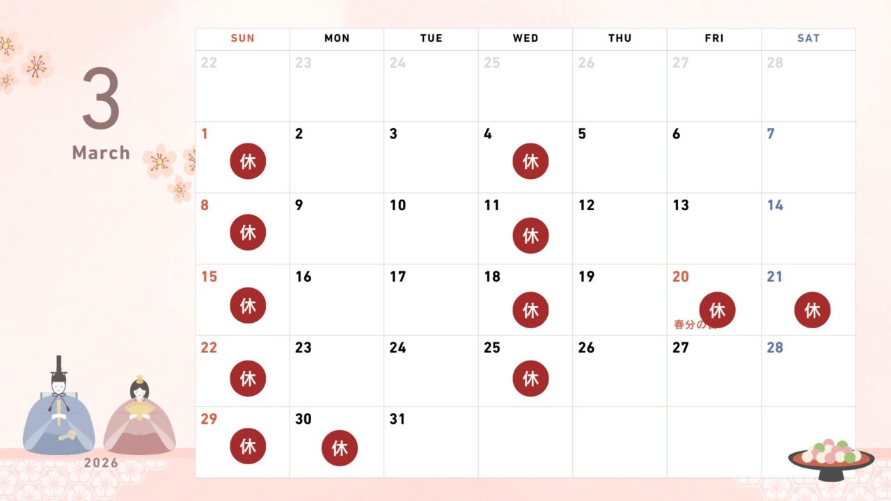 ニュース3月の休診日 shirokuma 2026年2月27日 3月のお休みです。カレンダーの通り、水曜日・日曜日が定休日のため休みになります。祝日と臨時休業として3月20日・21日・30日は休みになります。休み期間中・休診中の時間は、ご連絡はLINE@からお願いします↓↓
