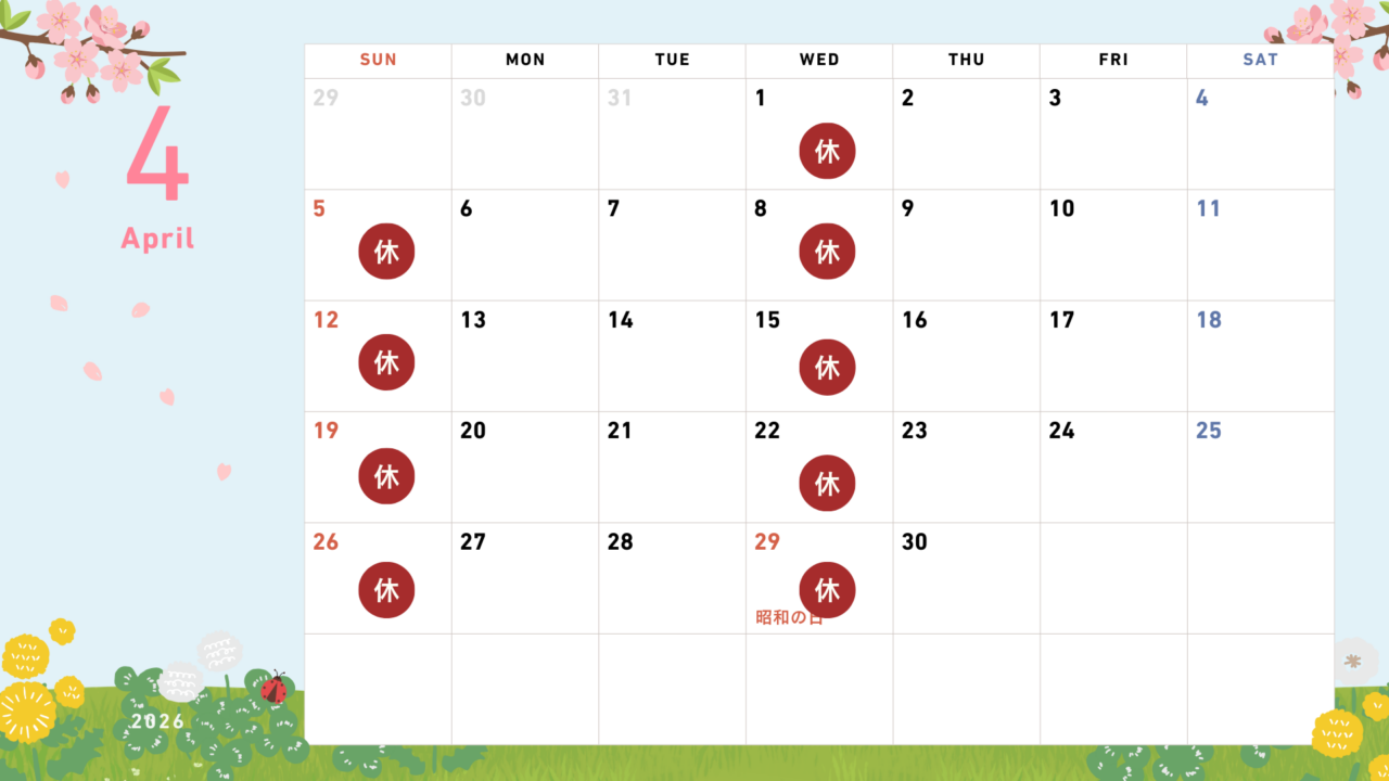 ニュース4月の休診日 shirokuma 2026年3月30日 / 2026年3月30日 4月のお休みです。カレンダーの通り、水曜日・日曜日が定休日のため休みになります。休み期間中・休診中の時間は、ご連絡はLINE@からお願いします↓↓↓