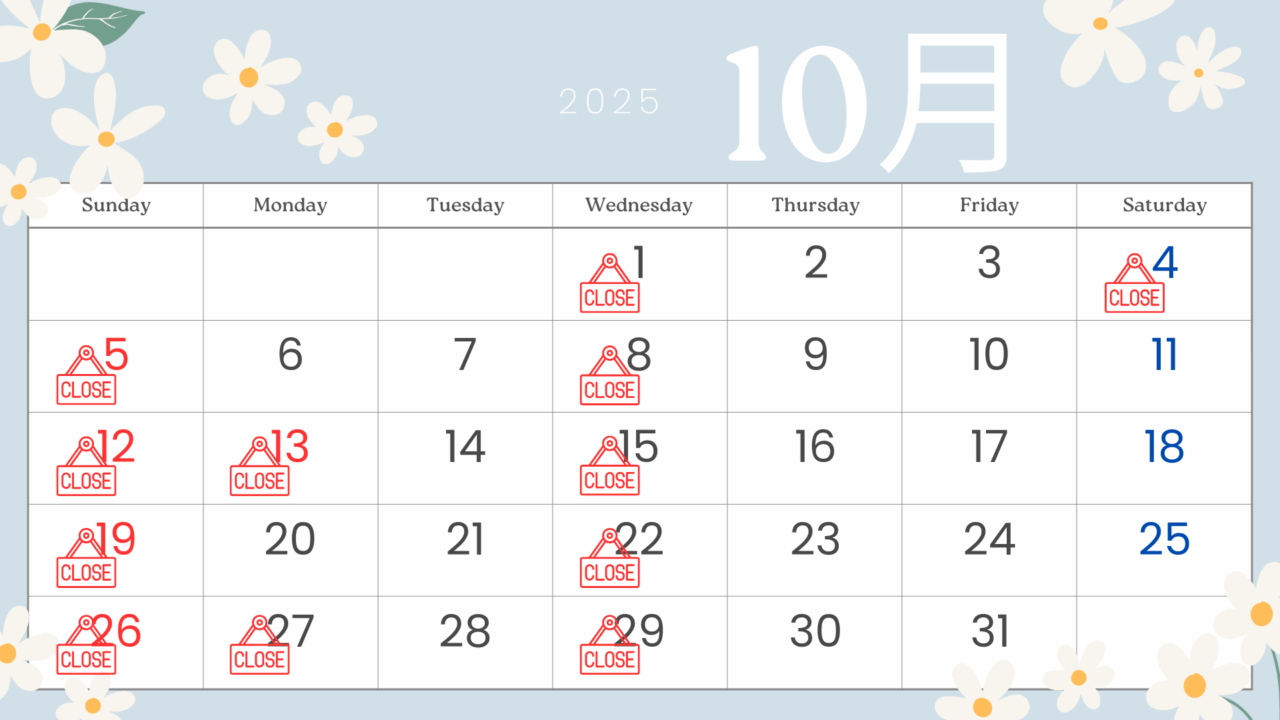 ニュース 10月のお休みについて shirokuma49 2025年9月1日 10月のお休みです。 カレンダーの通り、水曜日・日曜日が定休日のため休みになります。 10/13は祝日のため休みとなります。 10/4と27日は私用のため休みとなります。 休み期間中・休診中の時間は、ご連絡はLINE@からお願いします↓↓↓