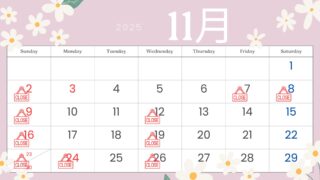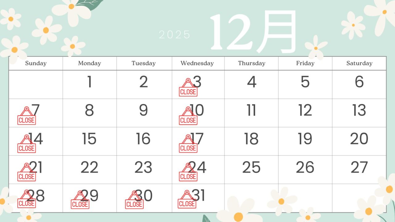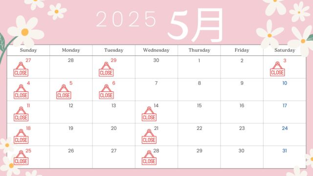 • カレンダーの通り、水曜日・日曜日が定休日のため休みになります。